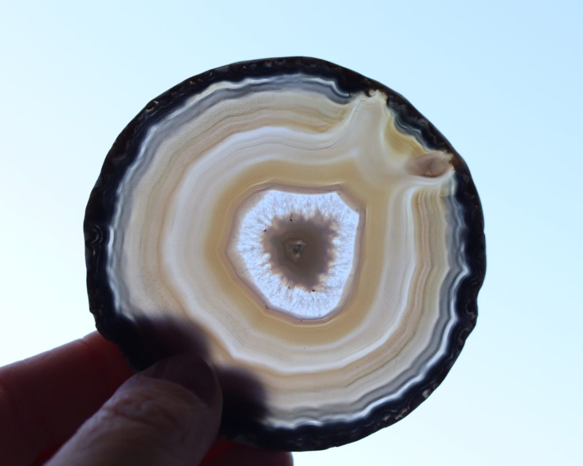 De agaatschijf is ca. 7,5 cm groot, weegt ca. 58 gram en is 0,5 cm dik.