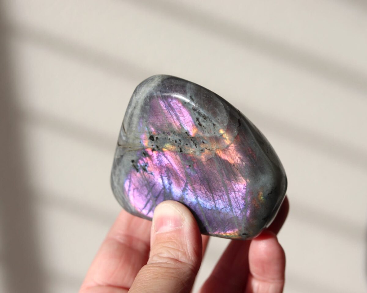 Een Labradoriet sculptuur vol diepte en kleur. De roze, paarse en oranje gloed vangt het licht op een subtiele manier. Dit stuk van 224 gram voelt krachtig maar verfijnd en heeft een formaat van circa 6,5 bij 5,5 bij 3 centimeter. Perfect voor wie houdt van natuurlijke schoonheid met betekenis.