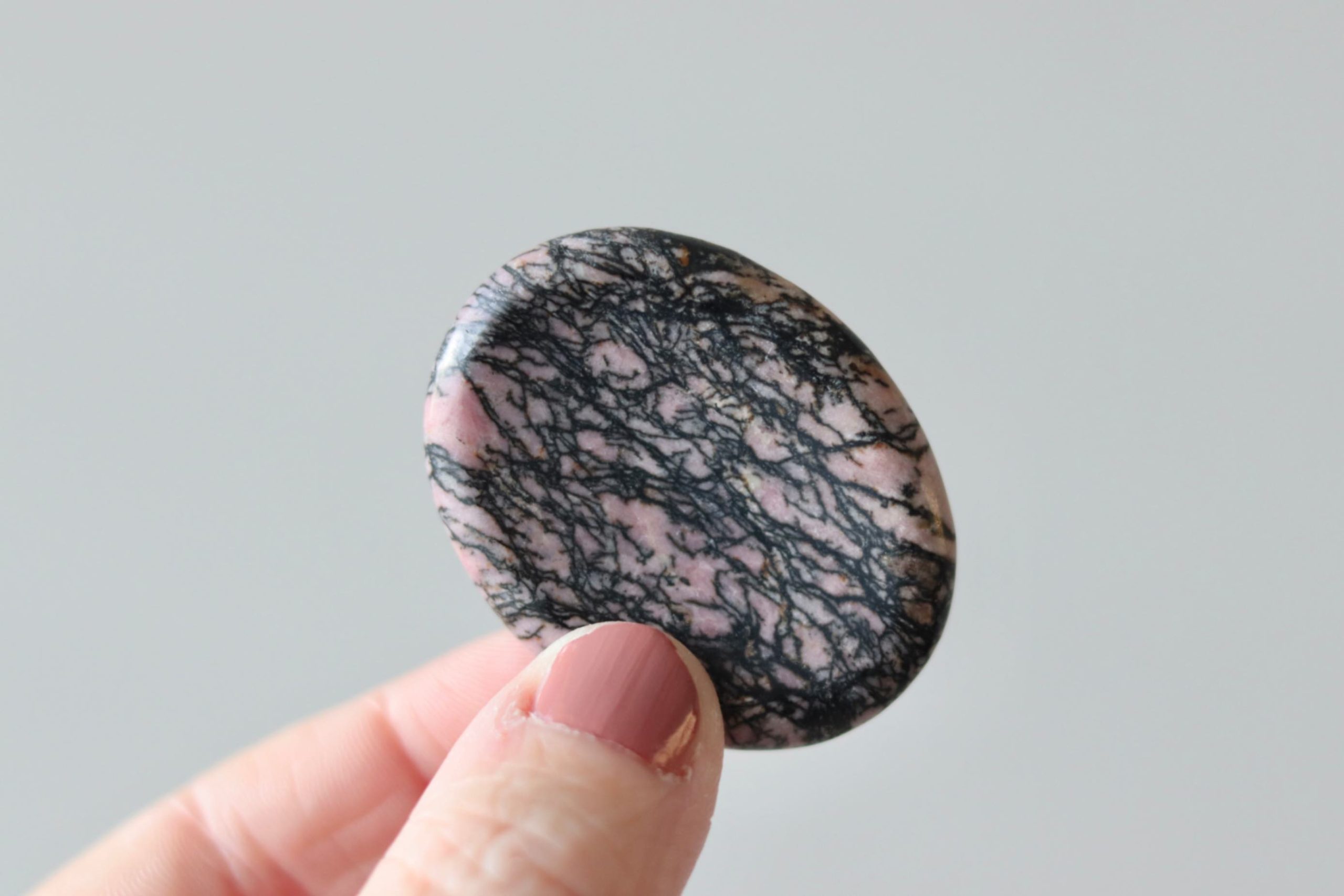Wat Rhodoniet extra bijzonder maakt, is haar uitstraling. De roze tinten kunnen variëren van zacht pastel tot wat dieper roze, met de contrasterende zwarte aders die iedere steen een eigen tekening geven. Daardoor voelt elke worry stone persoonlijk en uniek. Het is ook een mooi steentje om in huis neer te leggen op een opvallende plek, zodat je haar sneller pakt wanneer je daar behoefte aan hebt.