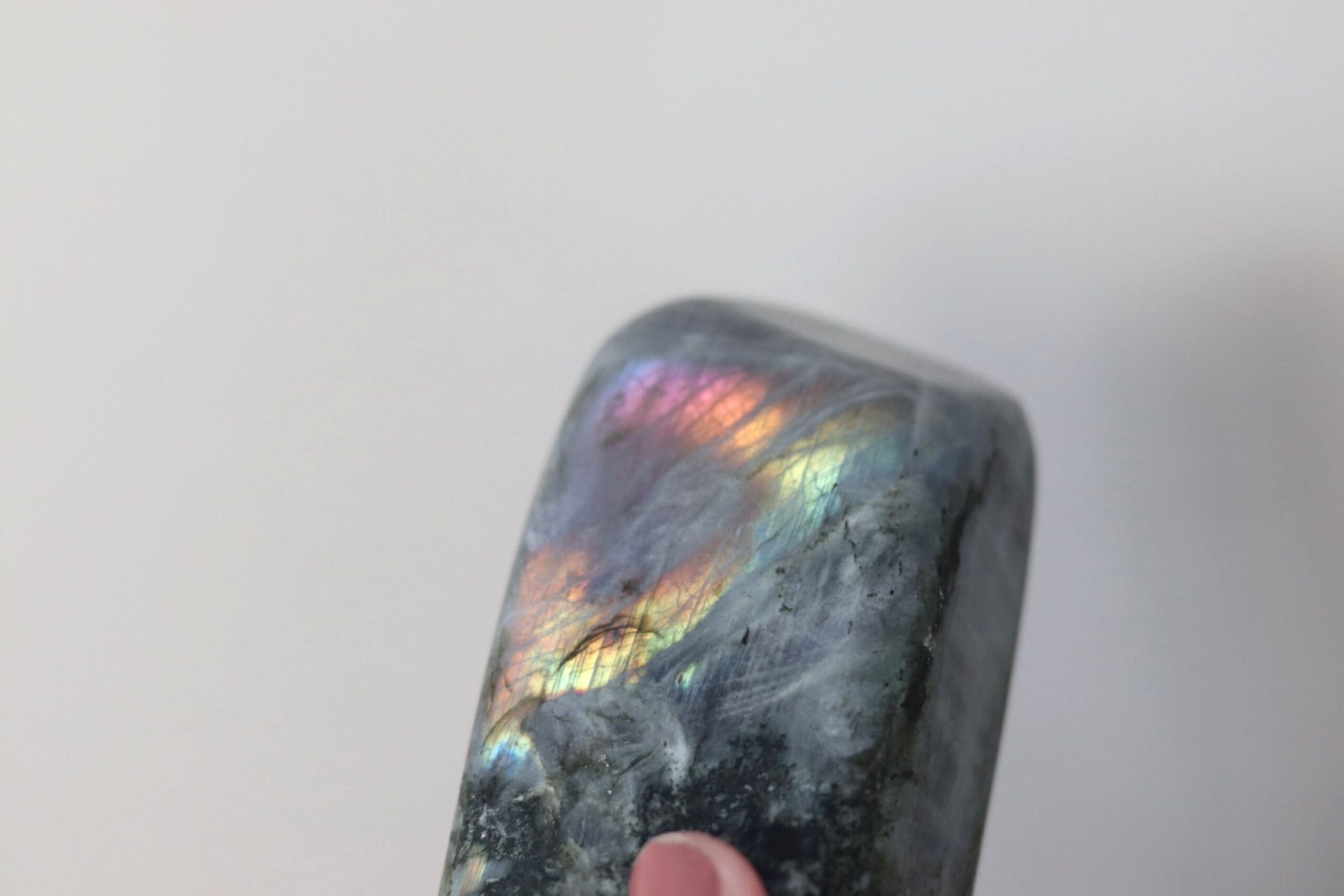 Dit unieke sculptuur van 194 gram en 4,5 x 8,5 x 3 cm laat prachtige kleurschakeringen zien zodra het licht erop valt. Labradoriet staat bekend om zijn beschermende werking en het versterken van intuïtie. Het is een fijne steen voor wie gevoelig is voor energie.
