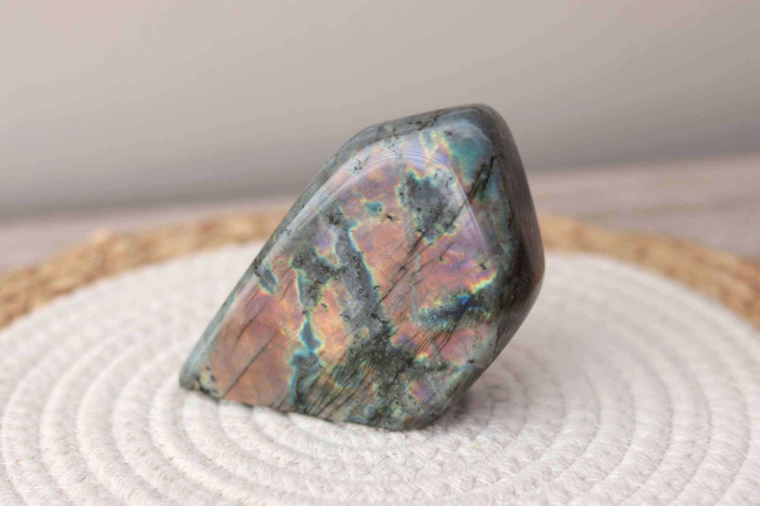 Dit unieke sculptuur van 194 gram en 4,5 x 8,5 x 3 cm laat prachtige kleurschakeringen zien zodra het licht erop valt. Labradoriet staat bekend om zijn beschermende werking en het versterken van intuïtie. Het is een fijne steen voor wie gevoelig is voor energie.
