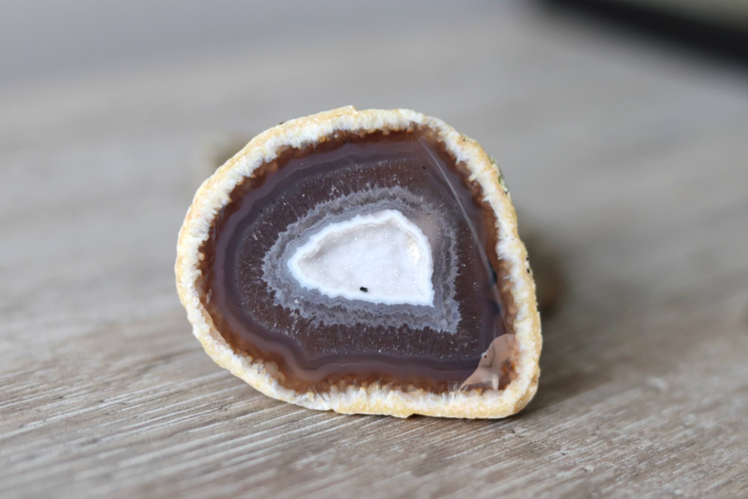 Ontzettend mooi agaat geodepaar is een sfeervol setje om neer te zetten in huis, juist omdat je twee bij elkaar horende helften krijgt die samen één geheel vormen. Door de banding, de warme kleuren en de druzy aan de binnenkant heeft dit geodepaar een uitstraling die meteen opvalt, zonder dat het te aanwezig wordt. Het is een natuurstuk met karakter, waarbij je in het licht steeds weer nieuwe details ziet.