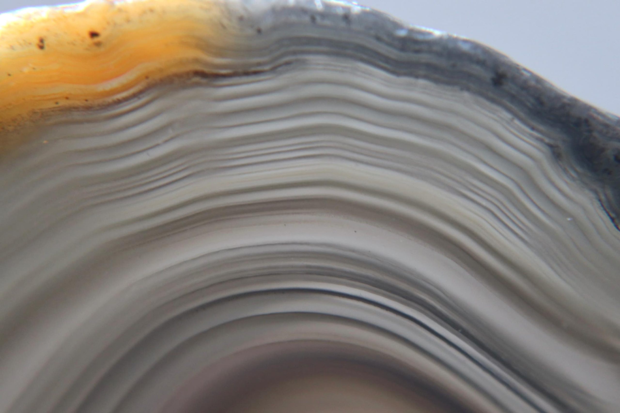 Dit is werkelijk een plaatje van een agaatschijf. In verschillend lichtval zie je het mooie lijnenspel in combinatie met de warme kleuren. Hier blijf je naar kijken.