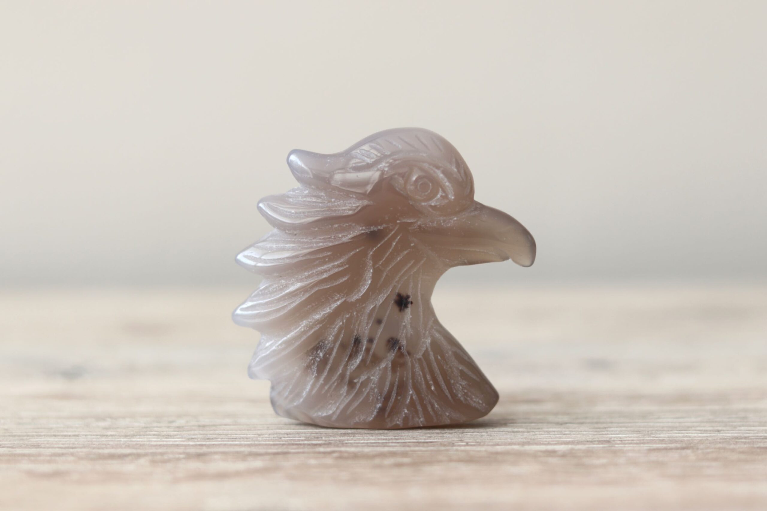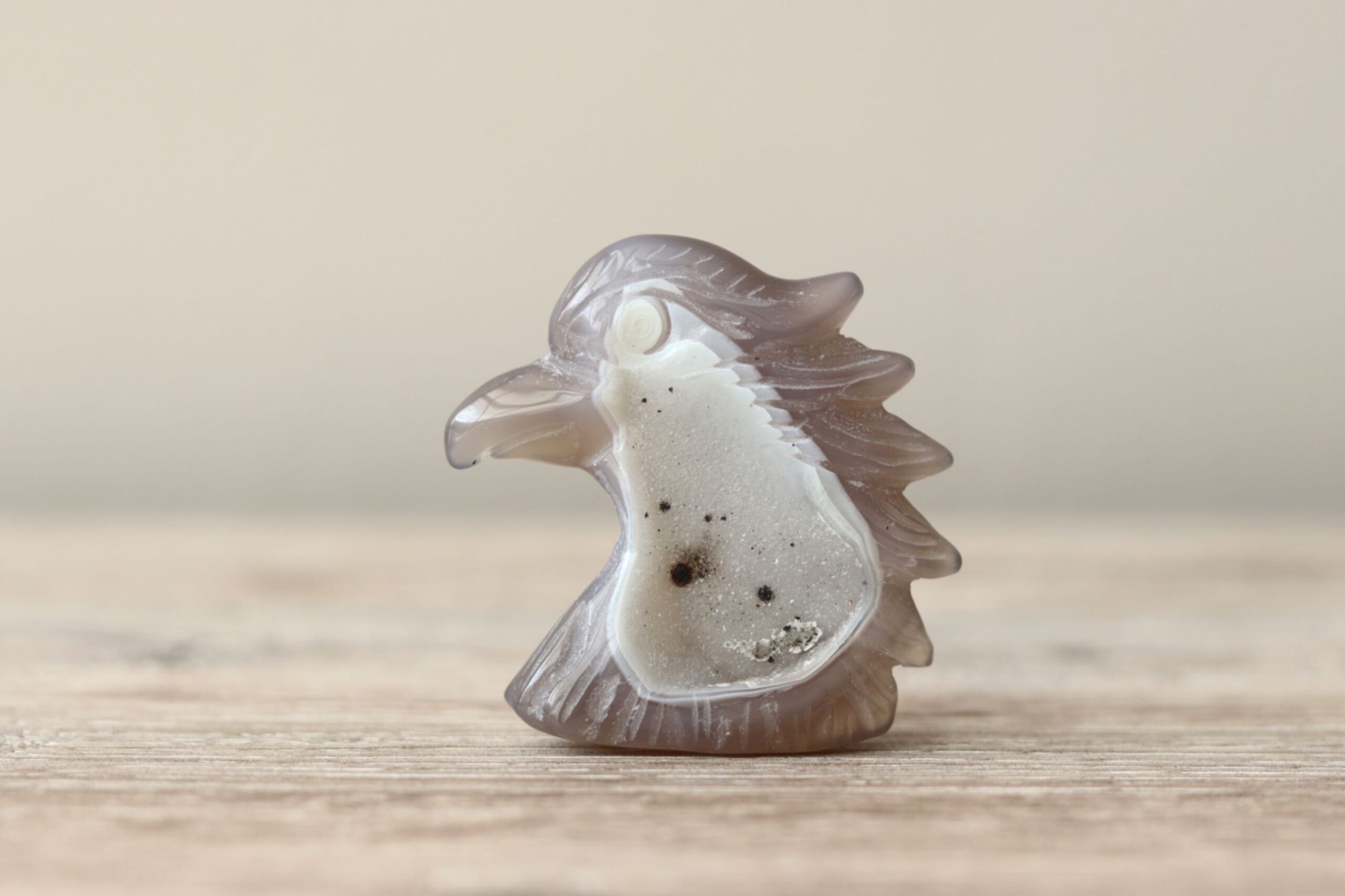 Unieke Druzy Agaat Adelaar met een levendige druzy-glans en natuurlijke patronen in het agaat. Deze adelaar van circa 5,5 bij 5 centimeter combineert kracht met verfijning. Hij kan zelfstandig staan, al blijft elk handgesneden beeldje iets kwetsbaarder door de fijne details. Een bijzonder stuk dat stabiliteit en vrijheid prachtig verenigt.