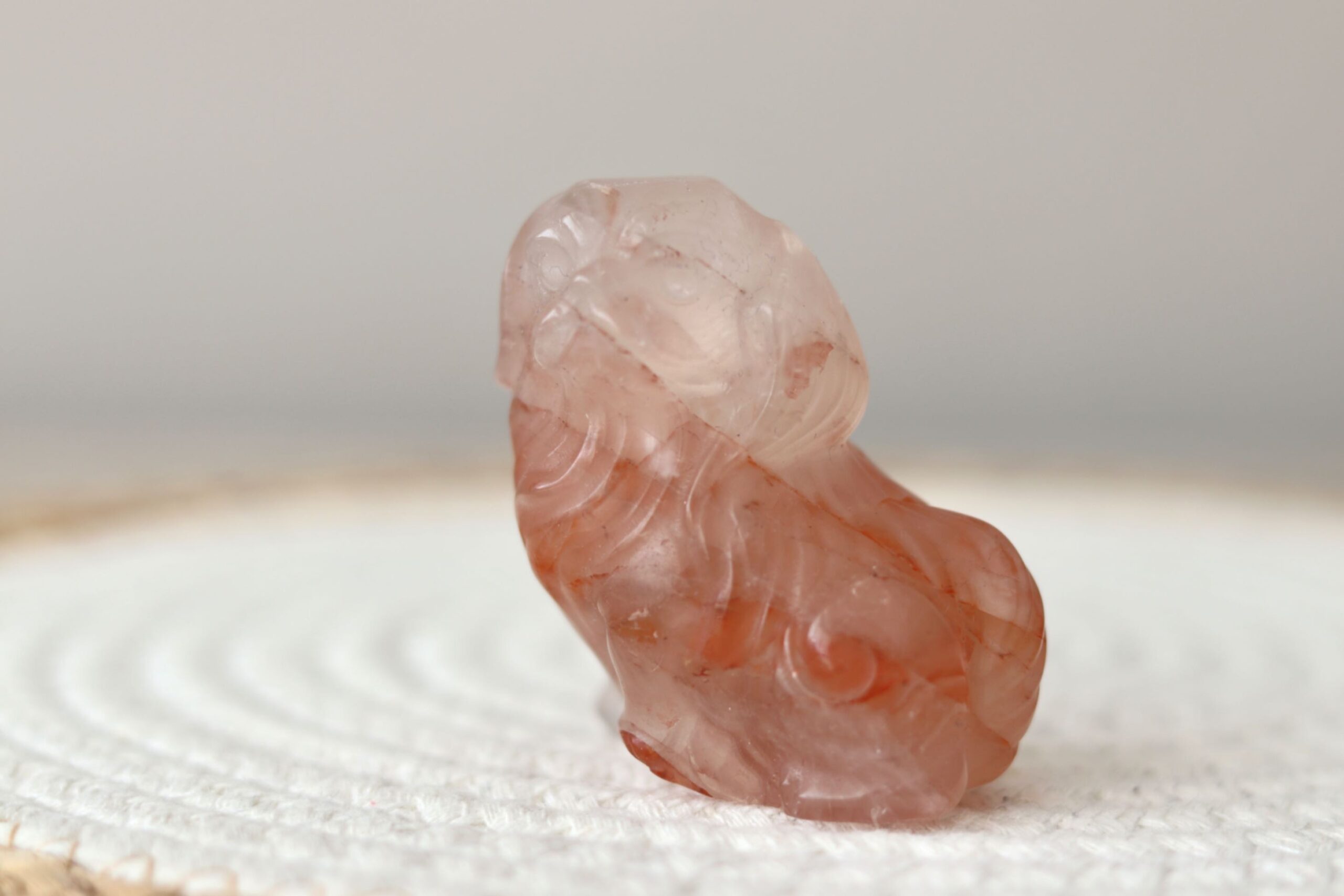 Een hond staat symbool voor trouw, bescherming en onvoorwaardelijke steun. In combinatie met vuurkwarts voelt deze carving als een kleine herinnering aan vertrouwen en kracht. Een mooi item om neer te zetten op een plek waar je vaak bent, zoals je bureau, nachtkastje of in de woonkamer.